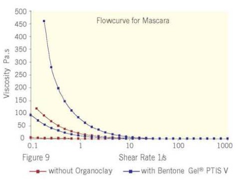 Bentone Gel PTIS V睫毛膏的流動(dòng)曲線顯示低剪切粘度和觸變性增加,應(yīng)用性能增強(qiáng)(見圖9)。