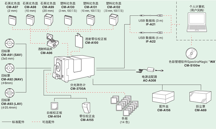 | 標(biāo)準(zhǔn)配件 | 白色校正板CM-A154,零位校正盒CM-A155,3×5mm目標(biāo)罩CM-A91,Φ8mm目標(biāo)罩CM-A92,Φ25.4mm目標(biāo)罩CM-A93,USB線1F-A21,電源適配器AC-A308,配件盒CM-A156,防塵罩CM-A69 |