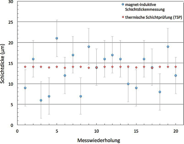 傳統(tǒng)磁感應(yīng)方法與Coatmaster熱層法的涂層厚度對比,測試在測量中的振動阻尼環(huán)上進(jìn)行確定