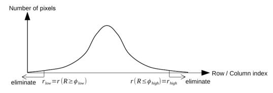 閾值濾波不需要去除所有脫離基板的像素點(diǎn),如圖3所示包含區(qū)域B。由于這些像素通常都比基材小,所以可以根據(jù)幾何位置進(jìn)行幾何濾波。根據(jù)圖像的行和列的位置對(duì)剩余未過濾的數(shù)據(jù)進(jìn)行排序。行(r)和列(c)坐標(biāo)如圖5所示。然后在幾何位置的分布上,消除的像素位置坐標(biāo)低于或高于百分比 ( 低和高 ) 中定義的限制值。