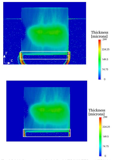圖5—在像素坐標(biāo)的2.5-97.5%之間的幾何閾值。上方圖是基板的原圖像,下方圖是經(jīng)過幾何濾波。圖3中B類型的大部分像素都被消除,除了包含在白框中的像素,以及圖3中的一部分 C區(qū)域。適用于可用數(shù)據(jù)范圍的縮放。