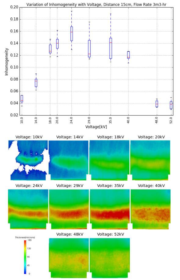 因此,在評(píng)估涂層工藝質(zhì)量時(shí),應(yīng)同時(shí)考慮涂層的均勻性。當(dāng)ACT值幾乎相同時(shí)涂層的均勻性可能會(huì)有很大的不同。從圖11和圖12所示的ACT和不均勻性對(duì)電壓的關(guān)系圖中,可以根據(jù)應(yīng)用推斷出理想的電壓范圍。例如,要求得到均勻薄涂層的工藝應(yīng)保持在10-14kv左右的低壓值,而電壓值在24kv以上會(huì)產(chǎn)生薄涂層,并且在基板的中間出現(xiàn)更厚涂層。在29-40kV范圍內(nèi)可以得到相同的分布,但與較大的ACT值有關(guān),之后涂層會(huì)隨著電壓的增加而變得更加均勻。