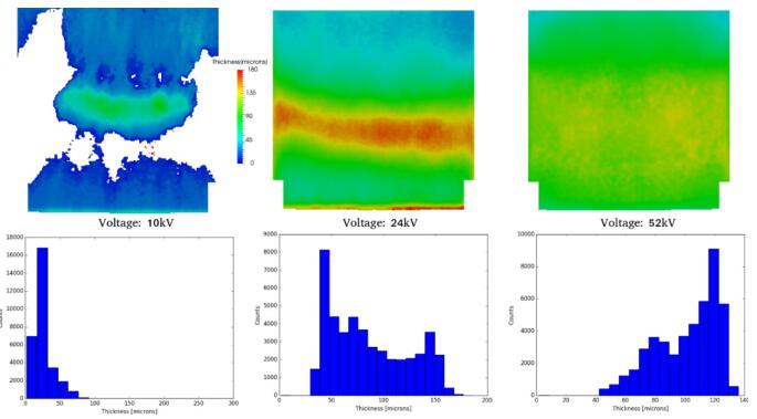 在電壓為10kv情況下,單個(gè)“bin”的像素較多,表明不均勻性較低。事實(shí)上,這種情況下的不均勻性比52 kv要低。但是,與最高“count”相關(guān)的涂層厚度值較小,因此 10 kv與最高“count”的偏差相對(duì)較大。而在52kV的情況下這種偏差很小,因?yàn)檩^大的涂層厚度與最高“count”有關(guān),導(dǎo)致出現(xiàn)類似的不均勻值。對(duì)于中壓情況,從直方圖中也可以看出,涂層厚度值分布較大,計(jì)數(shù)較大,兩者的結(jié)合導(dǎo)致了不均勻性的峰值。