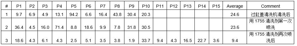 測試目的:1755清洗劑的有效性以及不同噴洗過程的清潔度差異。